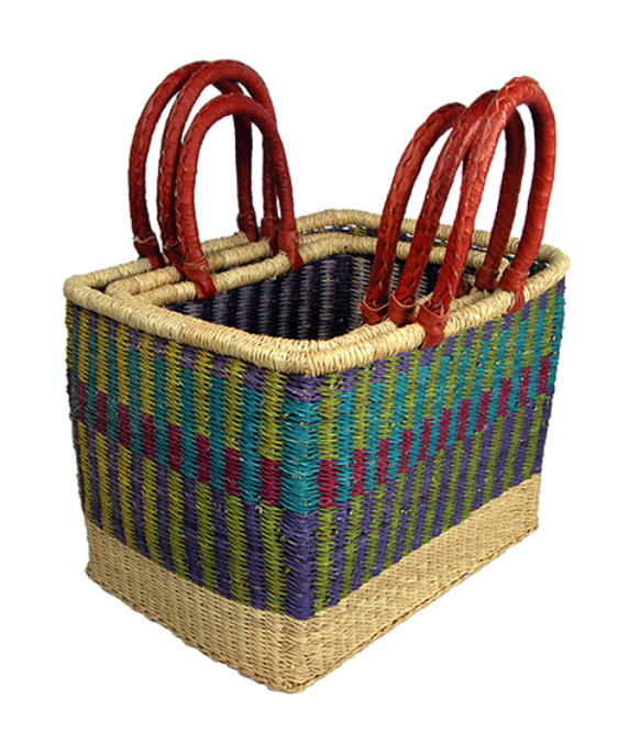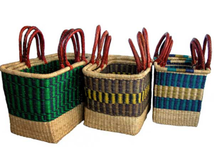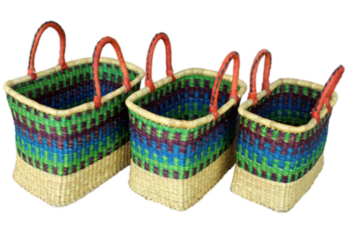 These stackable baskets stand upright and store easily. Baskets within sets usually have the same colors and patterns, but not always. Each basket has 2 leather handles.