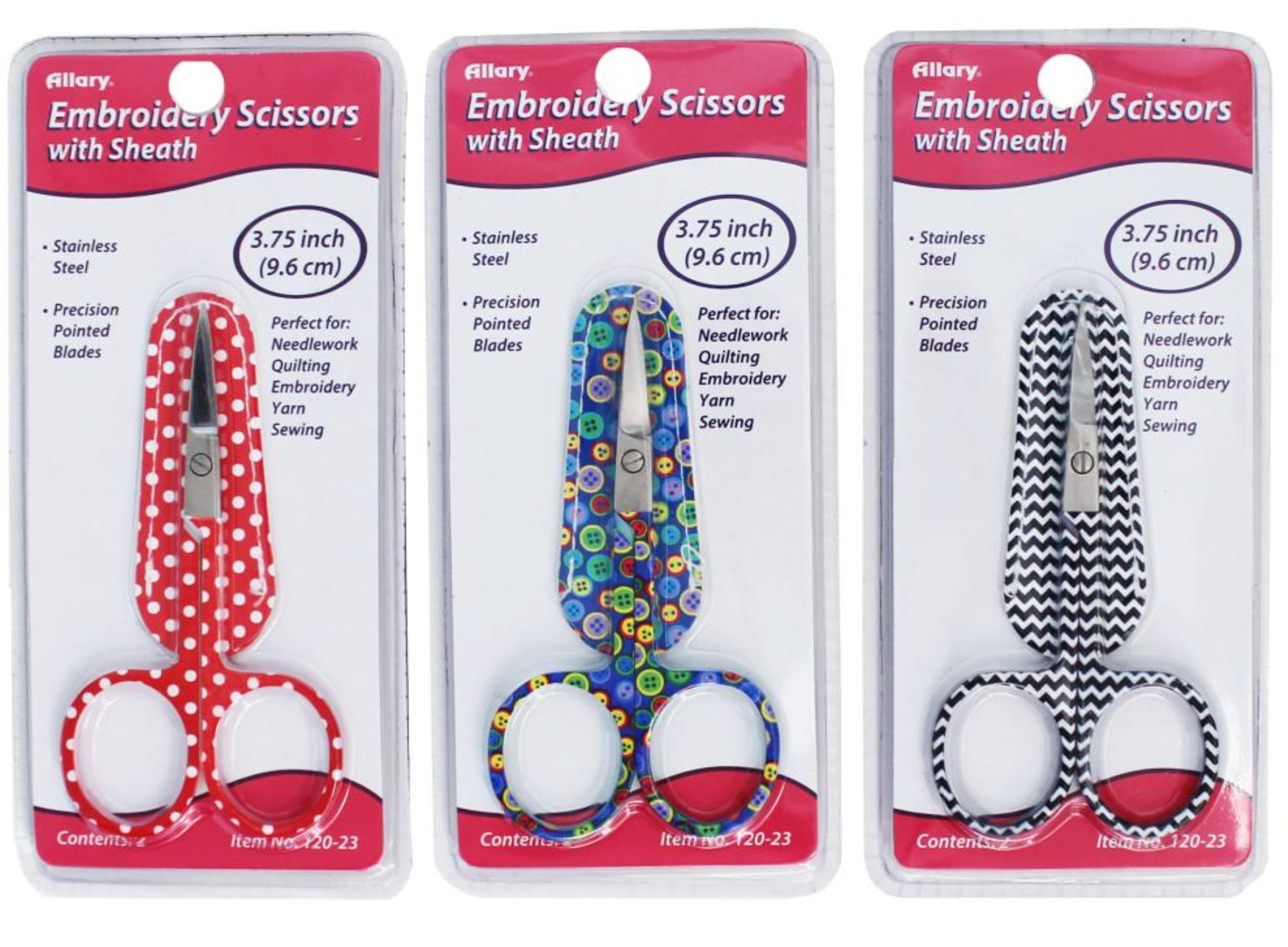 With its precision pointed, stainless steel blades, these scissors are perfect for needlework, quilting, embroidery, yarn and sewing. This package contains one pair of 3.75 inch embroidery scissors with leather sheath. Assorted designs are printed on the stainless steel blades. WARNING: May contain items with sharp edges. Handle with care.