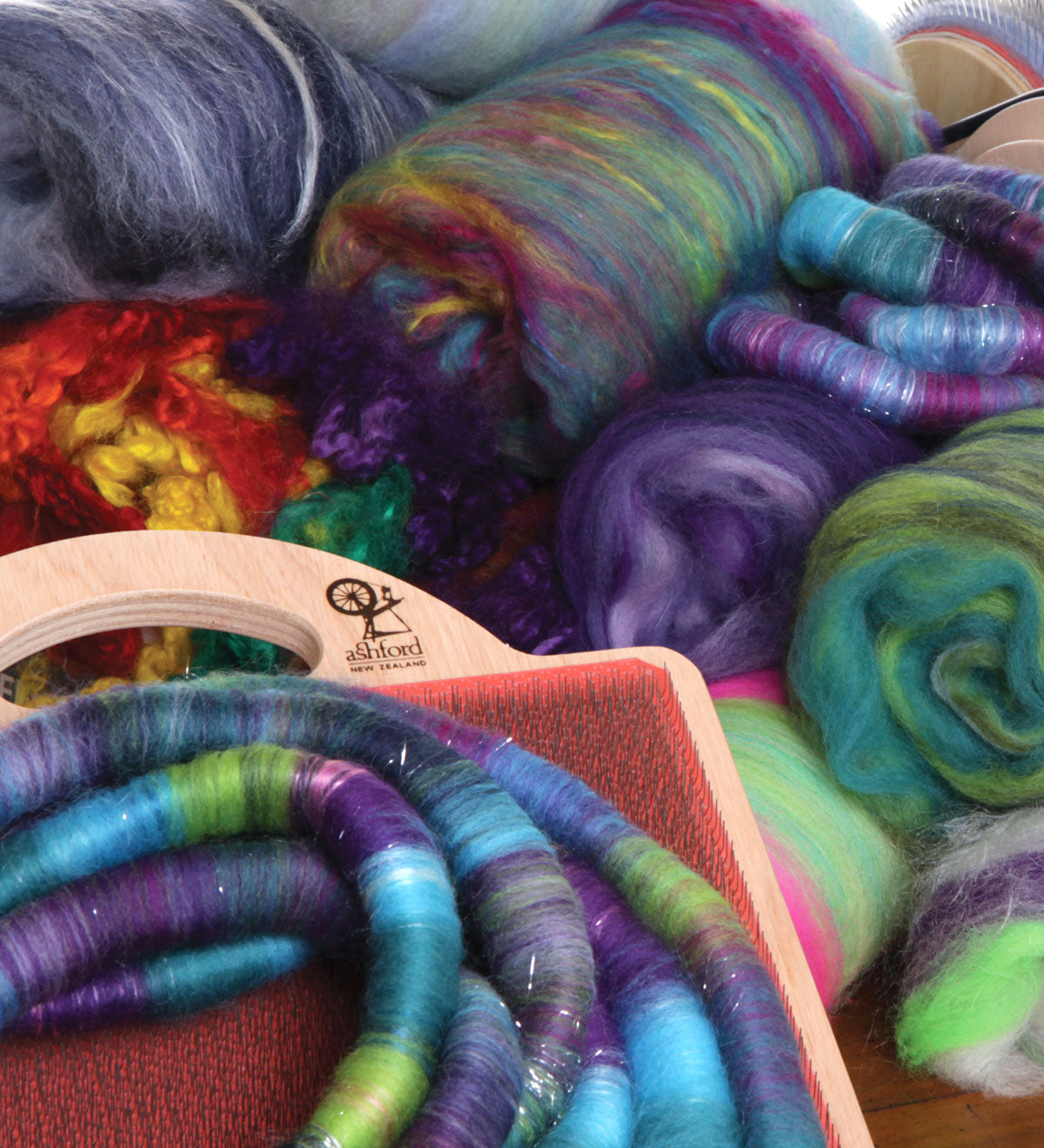 The blending board is the perfect tool for creating exciting, multi-coloured rolags for spinning, or batts for felting, and it’s lots of fun to use. It differs from other carding tools in that it allows you to ‘paint’ with fibre over a large, flat area of carding cloth to create controlled layers of fibre. The fibres are not stretched a great deal which gives greater definition of colour for maximum effect in your spinning or felting. The blending board is great for making self-striping yarns, or using up small amounts of fibre left over from other projects. Any fibre that takes your fancy can be added –wool sliver, uncarded wool staples, silk, alpaca, mohair, Tencel, or some Angelina for that extra special effect.