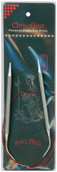 ChiaoGoo Red Line Circular 24" Knitting Needles. These fabulous needles are made of stainless steel and feature a flexible, multi-strand steel cable coated in nylon which allows yarn to slide easily with a very smooth joint between the needle and the cable and the ends of the needles are angled to cut back on fatigue.