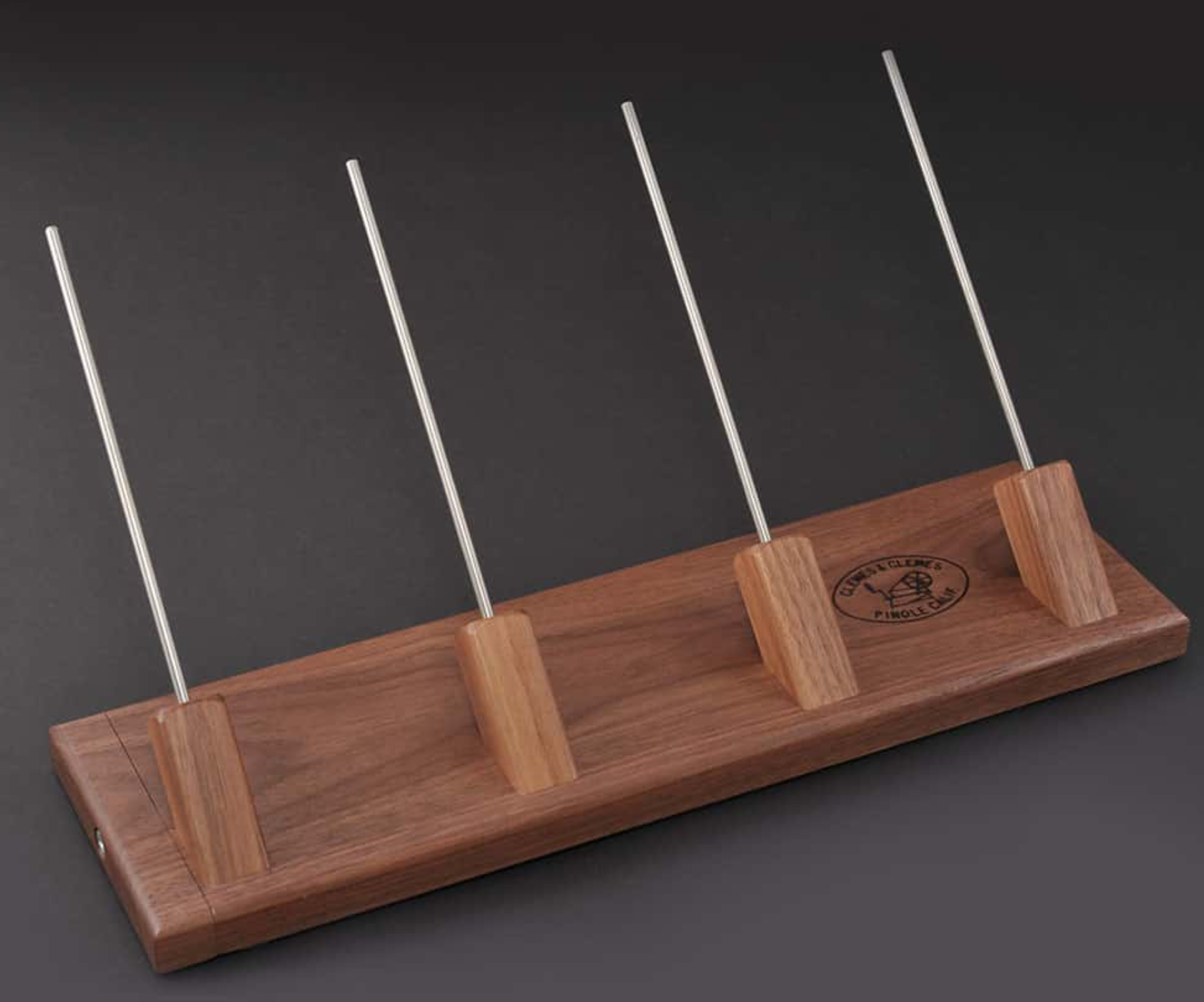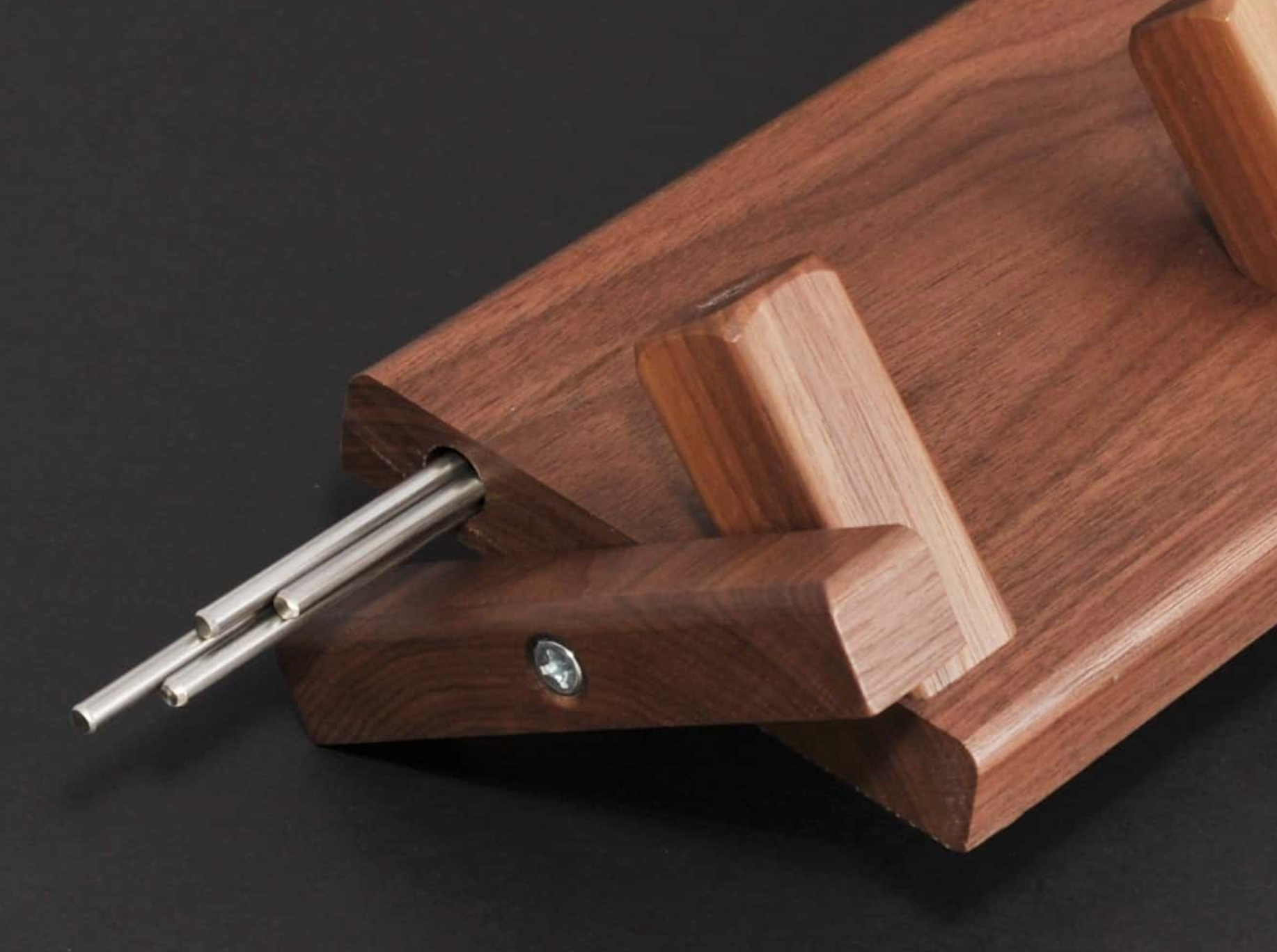 The stainless steel bobbin rods can be placed in a cavity in the base for storage or travel. Each JMac Lazy Kate is hand sanded prior to receiving a durable lacquer finish and being hand numbered and signed.