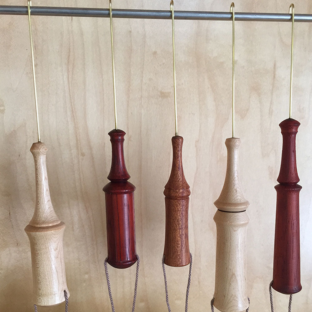 Our threading hooks are turned freehand. Each block of wood speaks differently to the turner, so each handle has a unique shape.