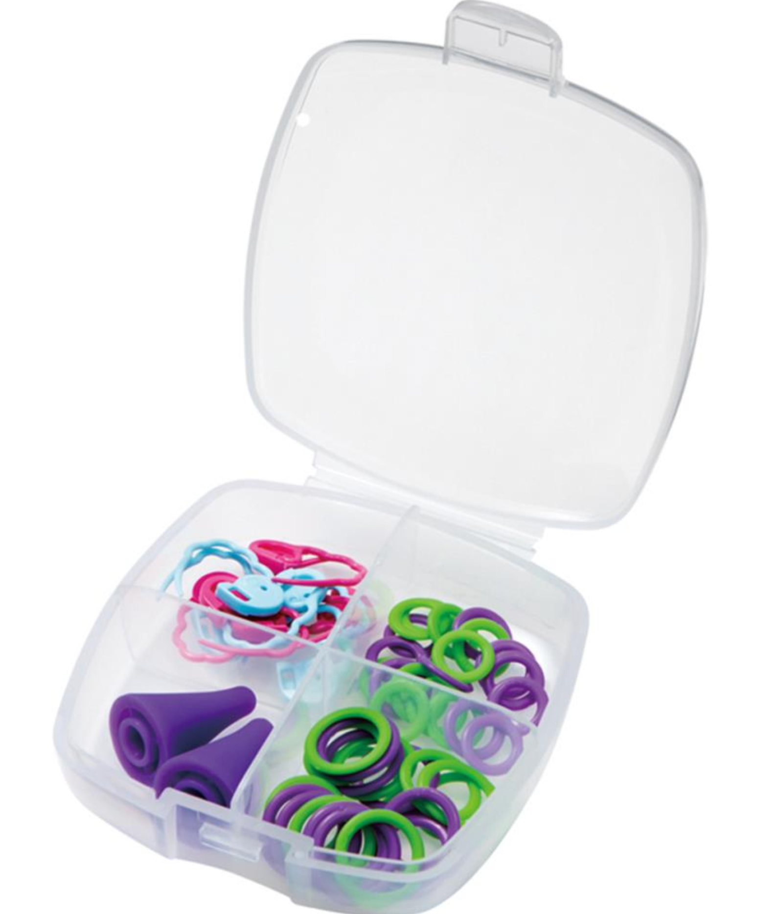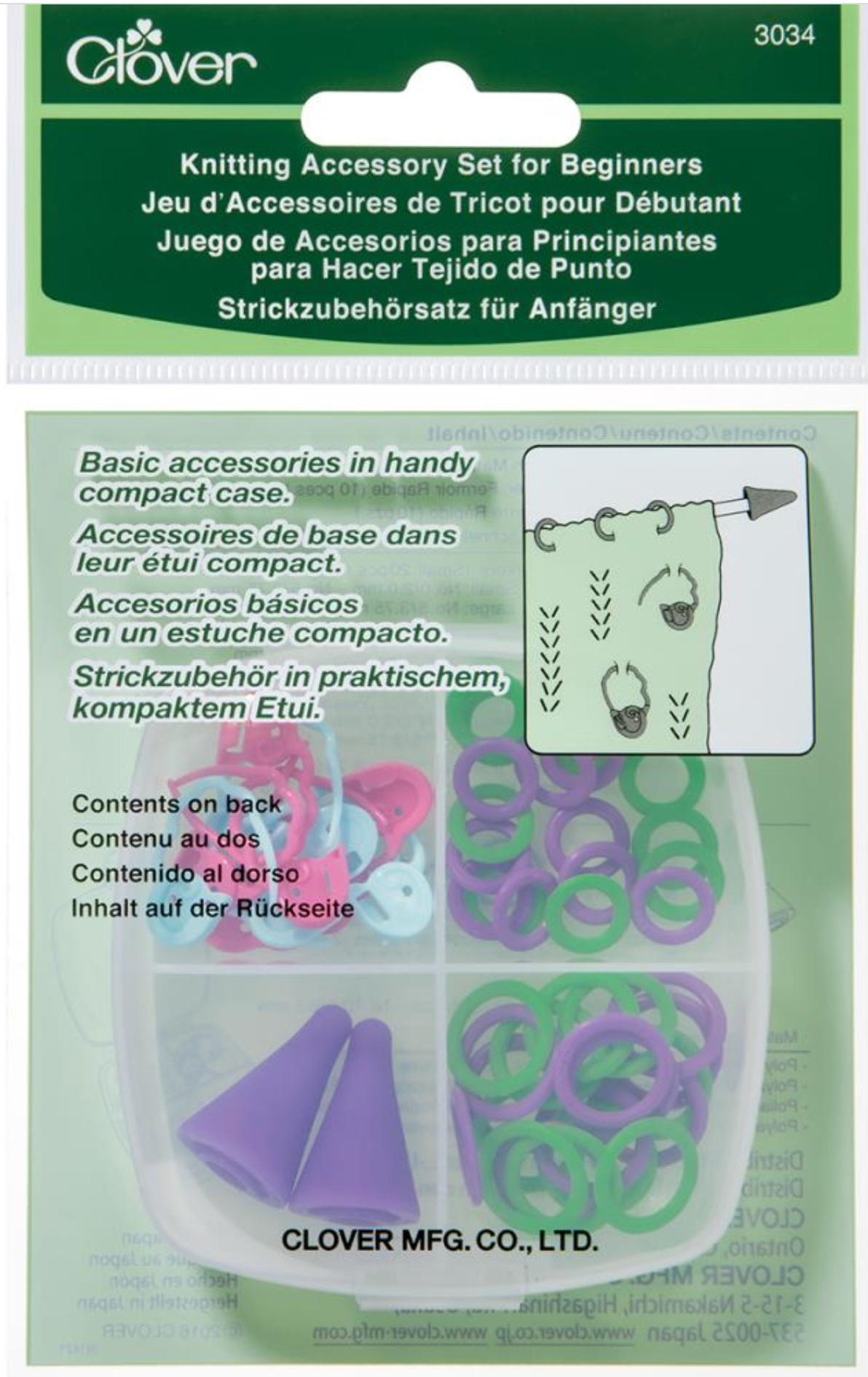 Clover-Knitting Accessory Set For Beginners. Find the basic accessories for beginners in a handy compact case! This package contains ten quick locking stitch markers, ten small stitch ring markers, twenty large stitch ring markers and two point protectors within one 3x3x.75 inch storage case.