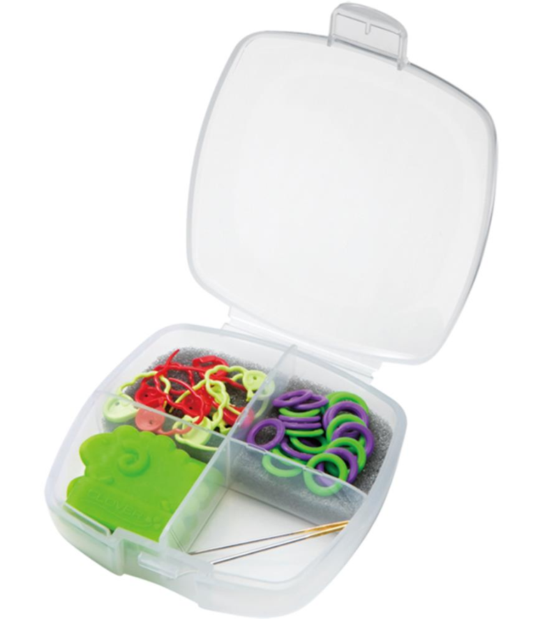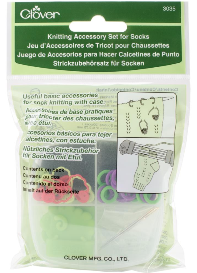 Clover-Knitting Accessory Set For Socks. This set is composed of useful basic accessories for sock knitting. This package contains ten quick locking stitch markers, twenty soft stitch ring markers, two double pointed need protectors and daring needles in No 20 and 21 within one 3/4x3x3 inch storage case.