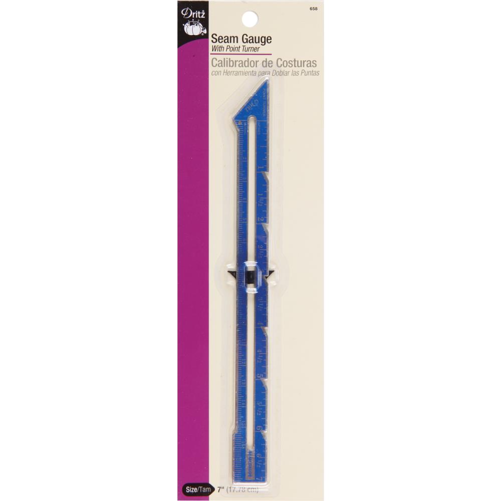 DRITZ-Metal Seam Gauge. A small multi-purpose metal ruler with a point turner and sliding right-angle marker that stays in place for repeated marking. Use the point to gently push out corners on collars, lapels, cuffs, pockets and waistbands. Use the sliding marker to measure and mark hem depths, seam allowances, establish button hole spacing and length and to evenly space tucks and pleats. This package contains one 7 inch metal ruler.