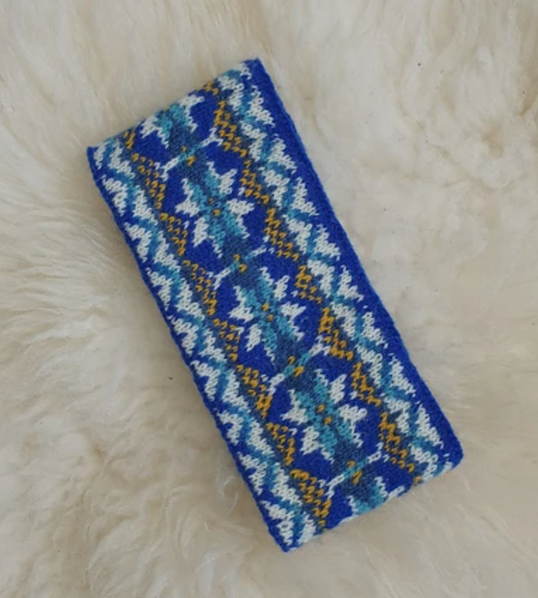Paper copy of the Harriets Headband pattern, a double sided headband knit in the round using Fair Isle knitting and 2ply Jumper Weight in shades 1A, 18, 91, 142, FC34 and FC47.