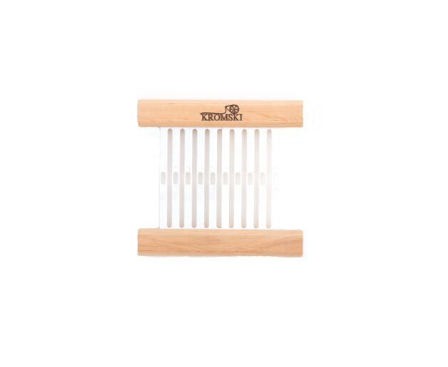 Heddles come in a variety of sizes called dents to allow you to control of number of ends per inch in your project. The standard heddle with each Kromski loom is 8-dent. Also available are 5, 8, 10 and 12-dent heddles. As you expand your weaving interests, you may want to have more than one heddle size.