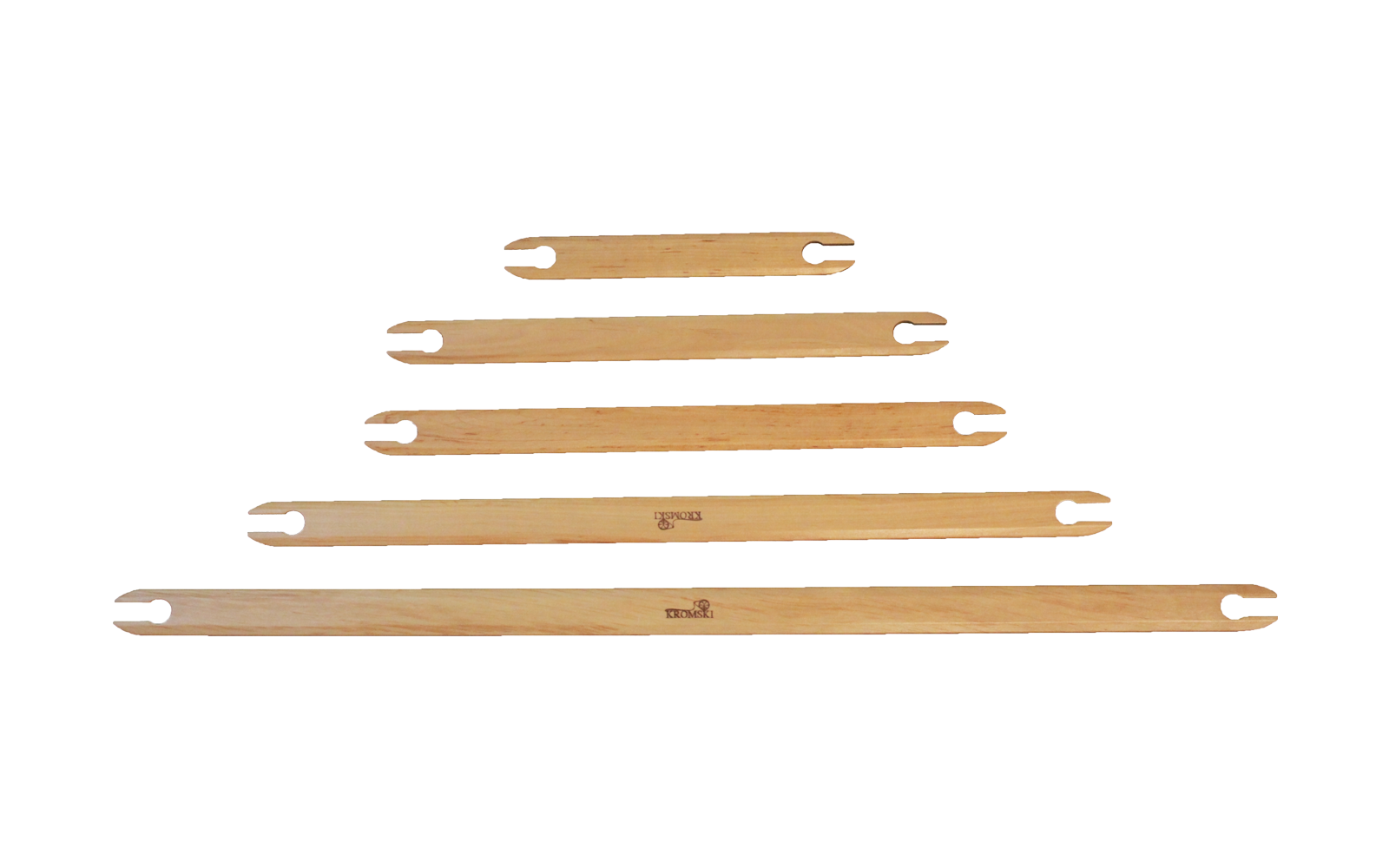 Stick Shuttles are available in the following sizes: 4″, 8″, 12″, 16″, 24″ and 32″. Each edge of the shuttle has a knife edge which allows you to use it to beat your weaving. Each Kromski loom comes with two shuttles.