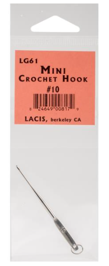Short steel nickel plated crochet hook with ring for attachment to chain, yoke, ring or chatelaine. Favorites for tatters, knitters and lacemakers for joinings and pick-up work. This package contains one 2.25 inch long #10 mini crochet hook.