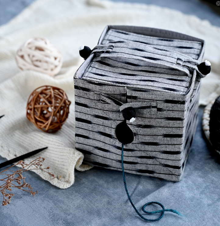 Lovely "IKAT" fabric box designed to hold and contain individual balls of yarn. This 5" x 5" x 5" box has a keyhole opening which allows yarn to feed out from inside, keeping it free of dirt and entanglement.