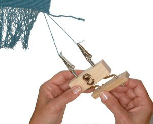 To twist fringe, decide on the number of strands to be included, and divide them into groups. Clamp one group into each clip, and holding the wooden crank in the center, crank clockwise as many times as desired or until the strands start to kink. Holding the ends of each group, remove them from the clips. Allow the bundles to entwine.Tie ends together with an overhand knot.