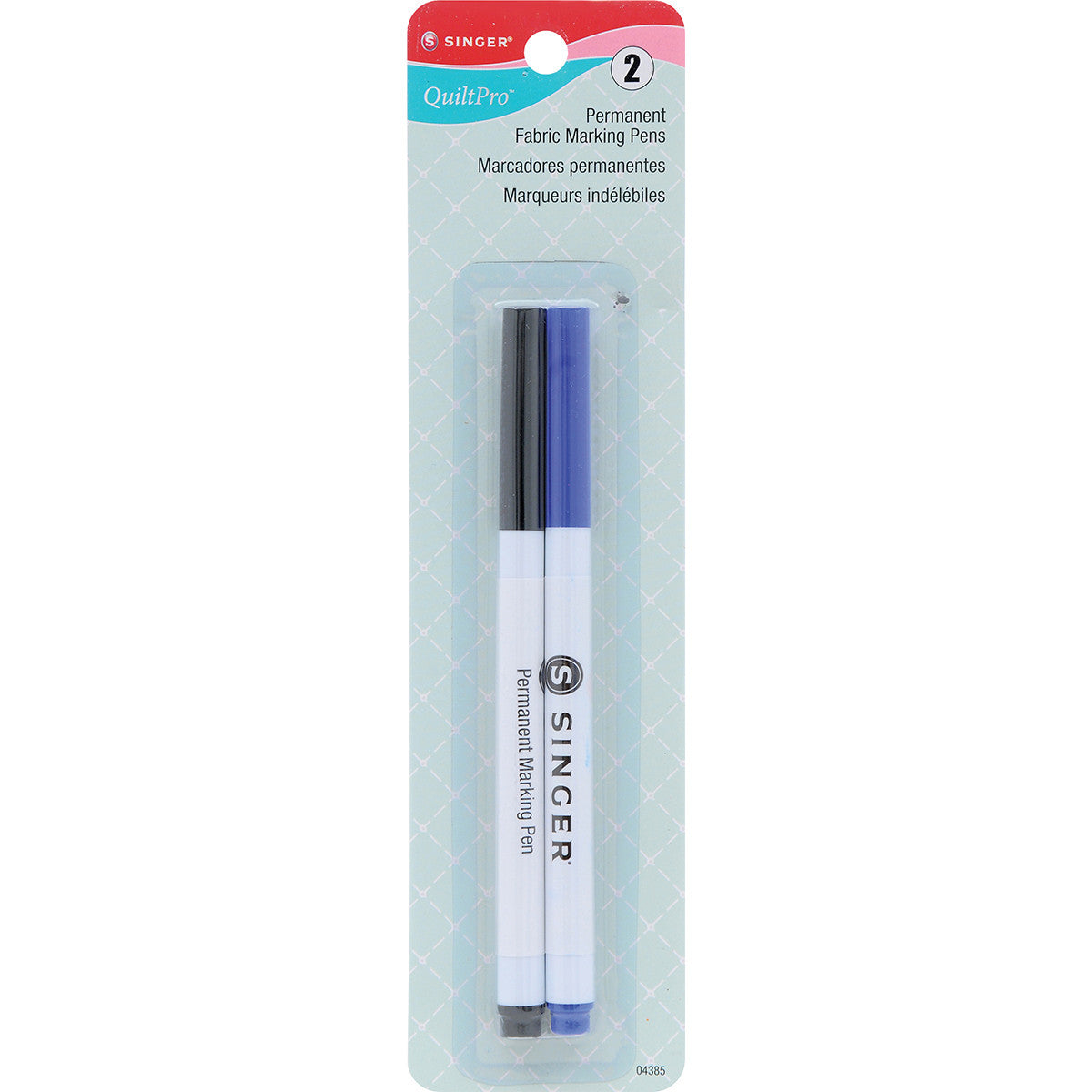 Singer-QuiltPro Permanent Fabric Marking Pens: Fine Point Black & Blue. Perfect for creating designs and patterns with permanent ink! Not for transferring embroidery or quilt designs. This package contains two 5-3/4 inch fine point pens in black and blue colors. Conforms to ASTM D 4236. Imported.