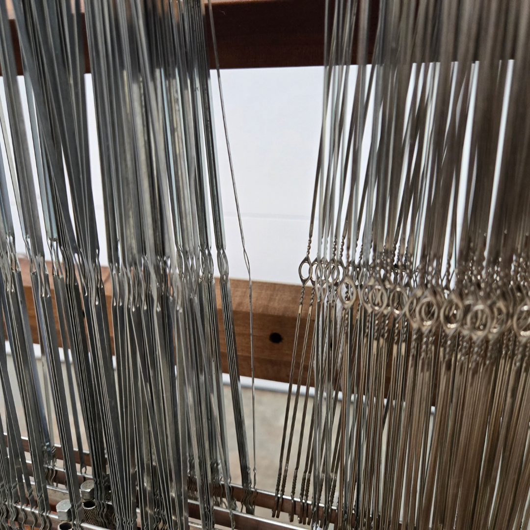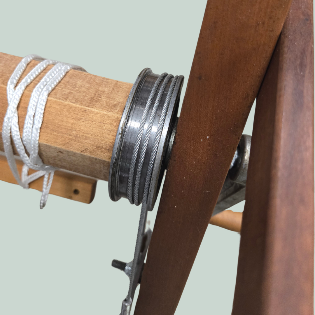 A dream loom for those who want the versatility to switch between narrow and wide warps with its' 46" weaving width. This loom is in fabulous condition, boasting a beautiful patina on this Cherry standards. Folding back beam allows the loom to move easily through doorways, make room in your room or just get extra close for front-to-back warpers. A mix of flat steal and inserted eye heddles, you can decide which are your favorite or work with both. Confirmed break assembly in good working order.