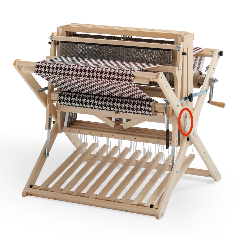- Insert the screw through the hole in the end of the beater pin chain and through the hole in the beater pin holder. From the outer side of the loom, fasten the screw into the small pilot hole in the outside right leg (for Wolf looms) or the right upper side support, between the right castle side and the ratchet dog (for Standard Floor looms).