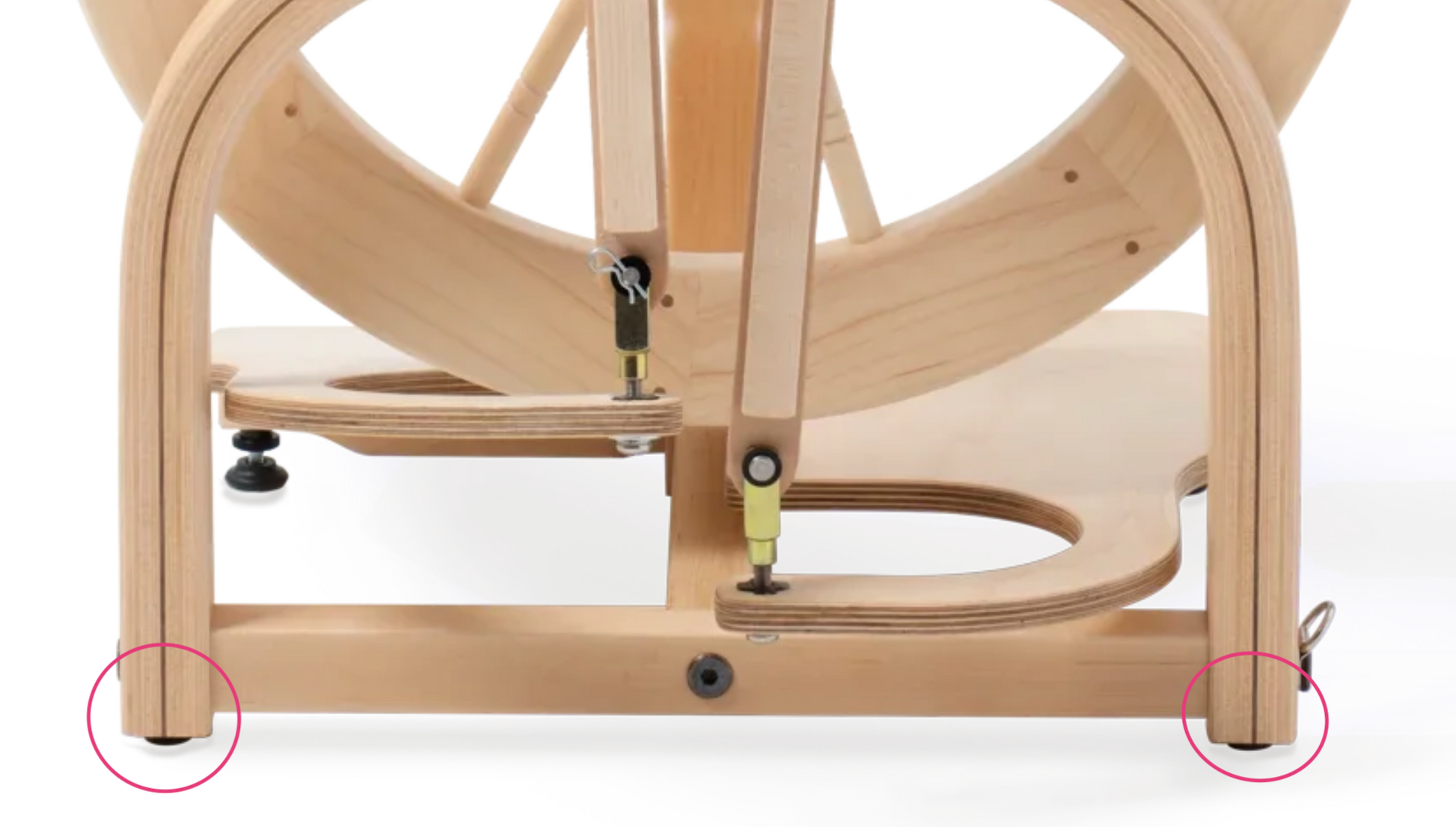 Front: Includes one each of the plastic foot, plastic lock nut, and barrel nut. Ladybug and Matchless wheels require two front leg adjuster feet. Fits all Ladybug wheels and Matchless wheels with a wood treadle support bar.
