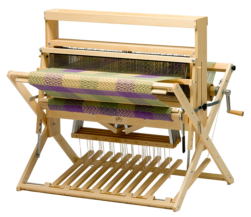The Mighty Wolf in response to requests from weavers who liked the Baby Wolf and wanted the same loom but wider. The Mighty Wolf has a weaving width of 36″, and uses the same X-frame design as the Baby Wolf. The Mighty Wolf comes with a high castle that includes a handy storage tray. Available in four or eight harness models, or Four Now-Four Later*.