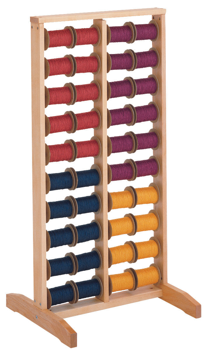 Our spool rack is essential for sectional warping. Ours will hold up to forty 4″ spools and has a center post that pivots for easy loading and unloading. The center post locks into place during use. Even though the spool rack is generally used for sectional warping. It can be indispensable for other studio tasks as well: holding standard yarn tubes and bobbins or as a place to clamp a swift or ball winder. Our spools are made of cardboard and measure 4″ wide with 3″ flanges.