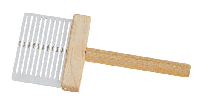 Warping paddles can save you time when measuring many warp threads. Our paddle makes it possible to measure up to 20 threads at a time. The slot-and-eye design alleviates the need to hand pick the cross. The square handle makes it easy to clamp our warping paddle to a shelf or table.