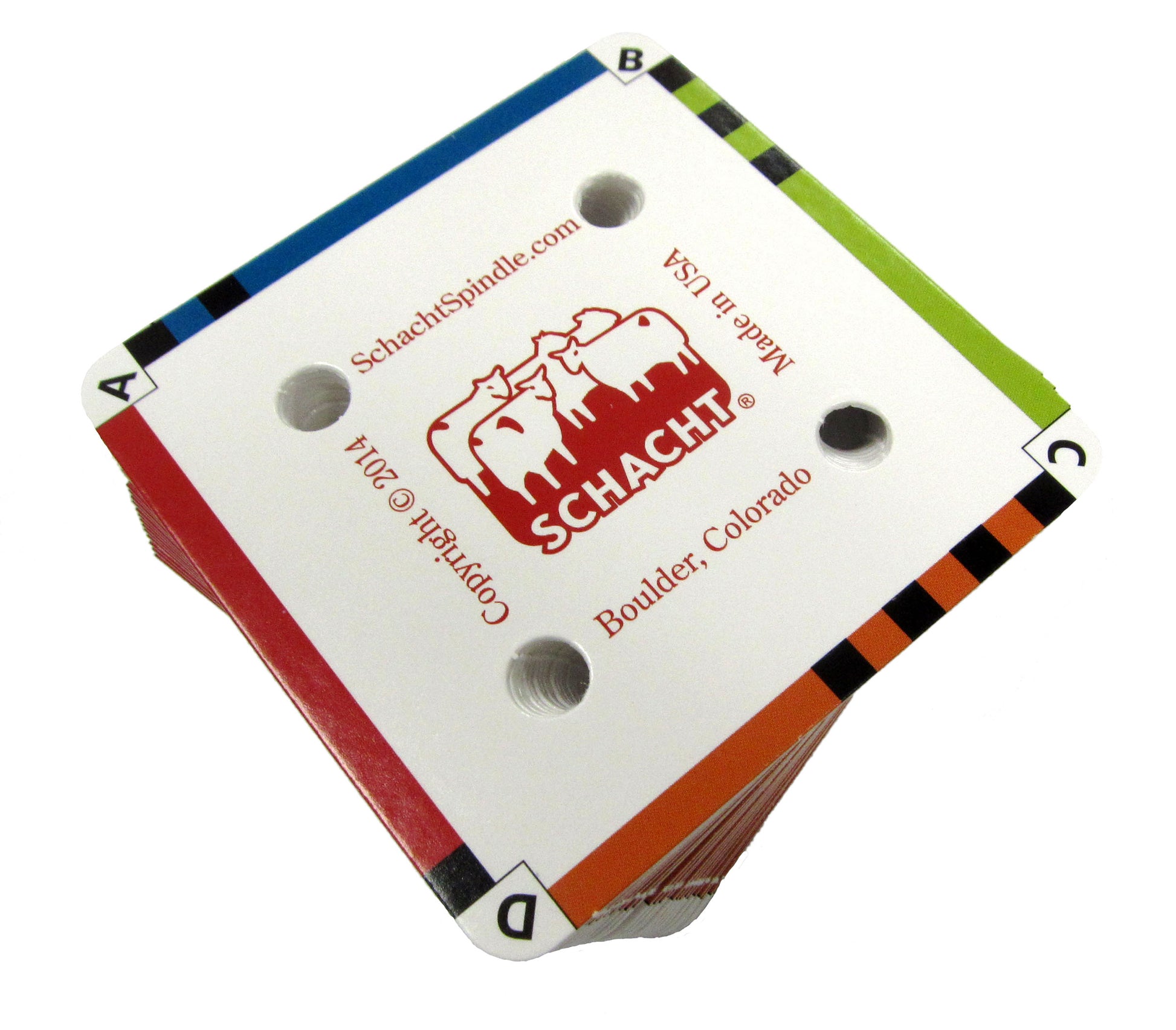 Schacht has developed a card that, at 3-1/2″ inches square, is comfortable in the hand without being bulky. Colored bands and stripes are printed along each edge as an aid in keeping track of the card’s position. Made of sturdy yet flexible 24-point card stock, these cards will serve you well over many, many warps.