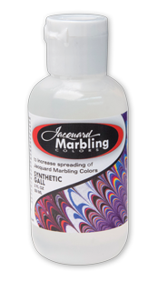 Adding Gall to Jacquard Marbling Colors increases how much a color will spread on the marbling size. Add it to the paint to make one color dominate over the others or to increase the coverage on the marbling surface. Gall can add a whole other dimension to marbling and gives you much more control over the behavior of the paints. Jacquard’s Synthetic Gall may also be used with other acrylic paints for marbling or increasing flow.