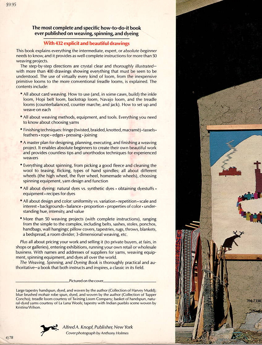 This big, beautiful book with 435 illustrations is the clearest and most comprehensive ever published on the subject--explains everything the expert or beginner needs to know on how to weave, spin, and dye.
